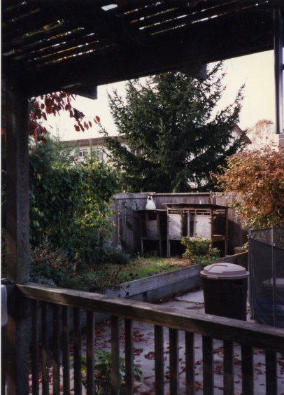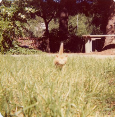 The whole family adored Mac, but he was always skitterish, not often cuddly. The older he got, the less he liked to be petted. He stayed outside most of the time and often sat on the rabbit hutch, facing the corner of the back yard fence, where he seemed to us to be in deep contemplation. If you look carefully at left, you can see his mostly white in the center of the picture.