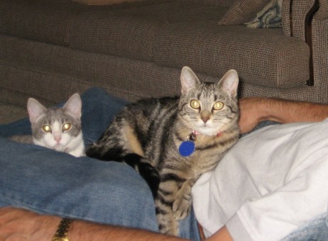 Then when we were out of town, Zoë was hit by a car and killed. She had been our favorite, serene and attentive, so we were terribly sad to lose her, after having her so short a time. But we still had Gus, who at the loss of his friend became a little less the wayfaring adolescent and liked nothing more than to sit on a lap for hours at a time.
