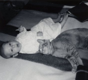 This second photo shows how the baby and Custard got along just fine. But Custard was always in the background, and not demanding or very important to our lives. We had human children keeping us busy and happy, five of them by the time he died.