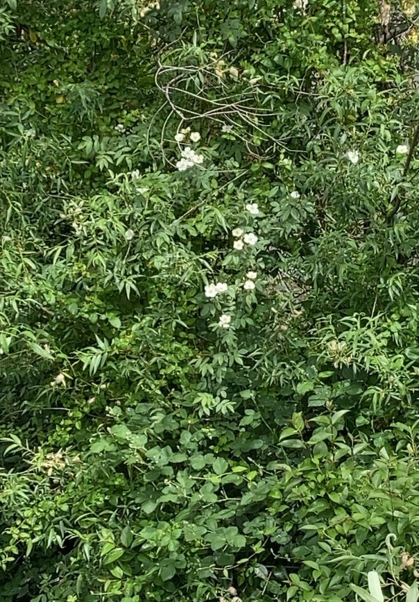 When Seek could assess the image better it identified it as Rosa multiflora or Rosa polyantha, a native of eastern Asia. It also told me I’d observed it two years ago near my daughter Pippin’s place in the farther north part of the state. These roses were to me the prettiest thing in all that jungle.