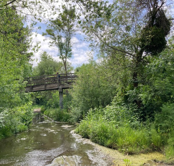 This evening I made it out for a walk, which turned into two walks, because of something new I saw on my usual route. I stopped at the bridge to look down at the seasonal creek that is getting low… and up at all the bushes and trees growing out of it. Every few years the city maintenance crew dredges out these waterways, but right now everything is growing lush and thick.