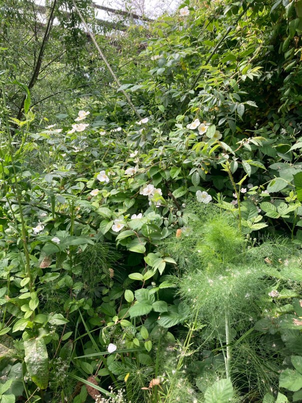 My, what a lot of plants in that mid-creek jungle! Once before I walked down there, but it was in September when everything starts drying up. The roses today were growing in the middle of the willows, honeysuckle, horsetail grass, fennel and bedstraw.