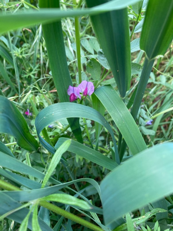 Many of the plants are naturalized from backyard escapees. The Bermuda grass for sure, and the lemon balm, and the roses. Wild blackberry brambles snagged my clothes and grabbed at my hair, but I managed to feel my way with my feet along the edge of the creek that was hidden by bullrushes, right up close to the flowers I wanted to see better.