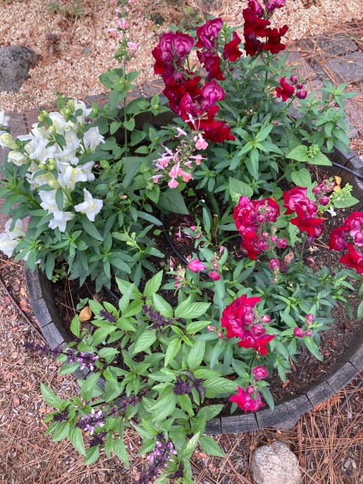 When I put in some snapdragon plants in late spring, I noticed a couple of tiny mystery plants that didn’t look like weeds, so I left them undisturbed. Now everything has filled out and I find that I have beautiful Thai basil and tropical sage complementing the snaps. Gardens are ever surprising.