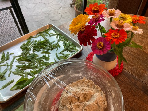 Buttery Sourdough Crackers was a satisfying recipe that used a bit of starter. This picture shows the dough as it was resting overnight, along with leaves of the lemon verbena that I am drying, after pruning my plant for the first time ever.