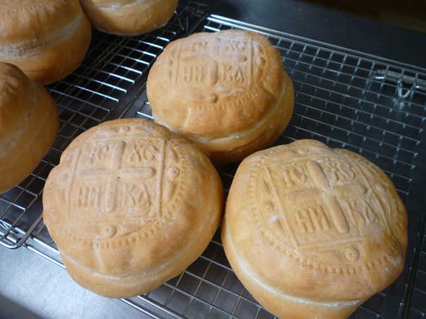 My parish has a team of bakers who prepare not only the loaves that eventually go into the cup of Holy Communion, but two other forms used in other ways in the services. There are several people who take turns making the dough in the church kitchen early in the morning on baking days, and different people who finish the process, shaping, baking, bagging and finally storing the loaves in a freezer. These top two pictures are of some exemplary loaves we’ve made recently.