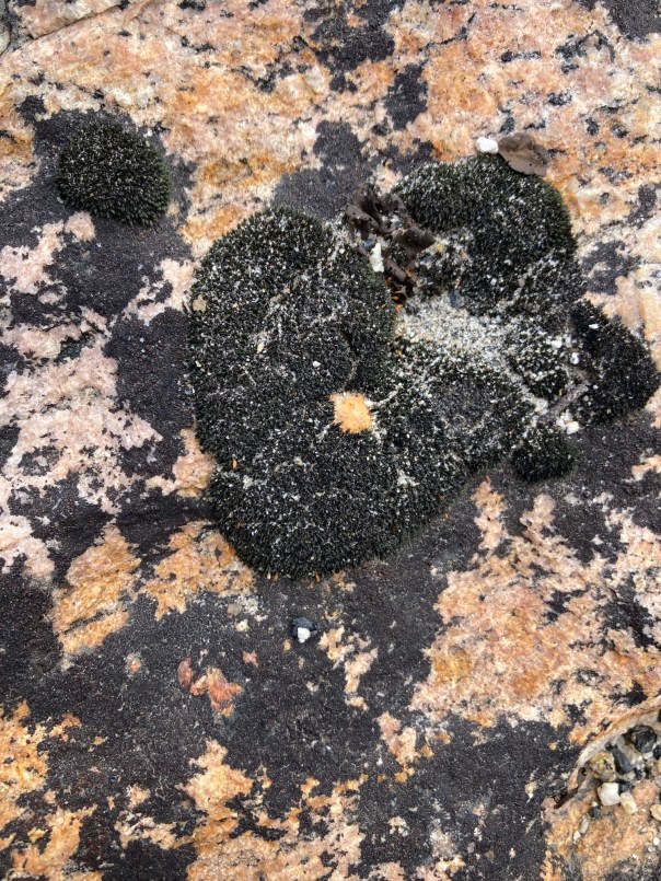 It took longer than expected for the whole expedition, because as we walked through an empty campground on the way, we met the campground host who loved to talk, and then his two “surprise rescue,” exuberant pups. That was fun, but eventually we started our ascent, which was slow and deliberate going as we adults cautioned the children about the gravel and the steep slopes. I avoided the trickiest gravel-strewn expanses of granite, and led our group into the manzanita ground cover higher up on the back of that hunk of rock, where we admired the lichens and flowers as we headed for the small dome to the side, which is easy to climb.