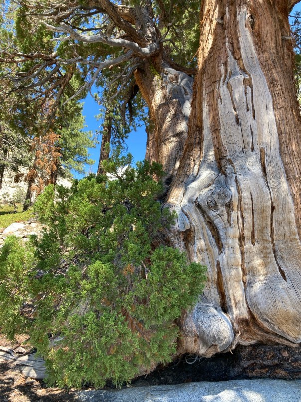 Then I found my friend, which is actually two trees intertwined, a Sierra Juniper and a pine. It/they were christened “Double Hug,” seeing as the two are in a forever embrace by means of large roots lying next to each other, and even their branches tangled together. We hugged the trees, and posed on the bench formed by those hugging arms.