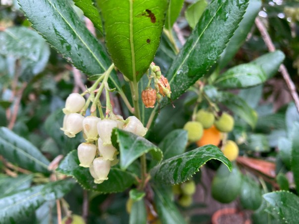 The arbutus we call the strawberry tree has both unripe fruit and blossoms as well. I remember the grandboys on a ladder picking the fruit one Thanksgiving, so those treats are yet to come as well.