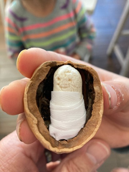 Decades ago I helped my children to do a “baby-Jesus-in-walnut-shell” craft, and this week Joy had all the ingredients for a new and improved version, which all the children enjoyed immensely.