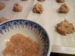 I’d seen recipes online for Heath Bar cookies, and I used one of them that didn’t have nuts. My version had a little less Heath ingredient, since we had snacked it down. The specialness I added was to combine some large-crystal sugar (Demerara) and coarse sea salt and roll the tops of the cookie-dough balls in that before baking.