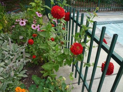 I suppose it’s because Pippin’s garden in the middle of the forest gets extra water, that the ferns constantly encroach. I was watering the new zinnia and dahlia sprouts and wondering at the robust ferns still popping up everywhere. They push against the deer fence that surrounds the vegetable and dahlia enclosure, and try to colonize the whole inside space, too.