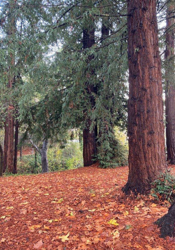 The sky and the clouds! It must be that rain in October and November make for a splendid season, and not just because of the lovely damp-but-mild feeling of the air. As I understand, the rain somehow makes the leaf colors brighter. I drove past a vineyard last week that surprised me so — the colors of the leaves were not just the usual red and yellow and orange, but wide-ranging in deep purples and pinks as well. In my garden the pomegranates have not started turning, and the snowball bush barely.