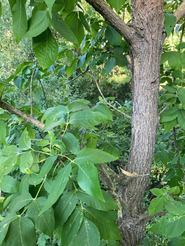 I looked forward to a lunch date in a short while, so I couldn’t explore as long as I’d have liked; I turned back, along my usual route, past the pineapple guava that I have known and noticed for as long as I can remember. Many huge fruits were on the ground, much larger than anything mine ever produces… probably because it gets full sun all day long. I bent over to pick up one that hadn’t been bruised, but it was hard. Odd, that it hadn’t ripened…. and then I saw, a few feet away, the horror: the whole tree had been hacked to the ground, and I became aware of a large empty space above me.