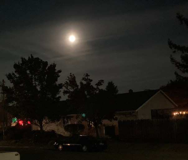 Last week at the full moon, we had nearly clear skies, so I took another moon picture from my driveway. The moon was noticeably more northerly from its summertime position, when I have more often been out there looking. I liked getting some of the Christmas lights of the neighborhood in the picture.