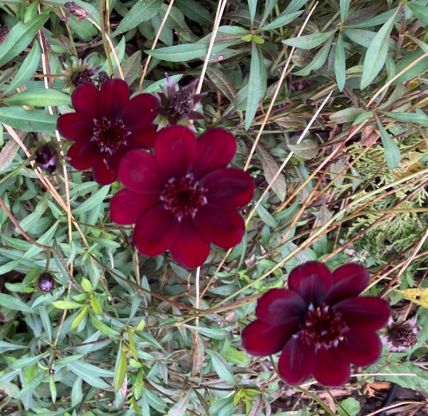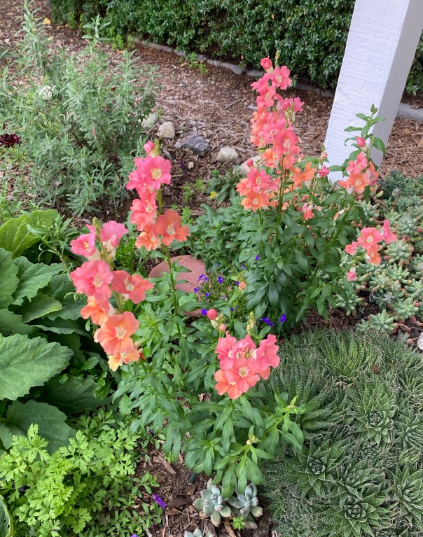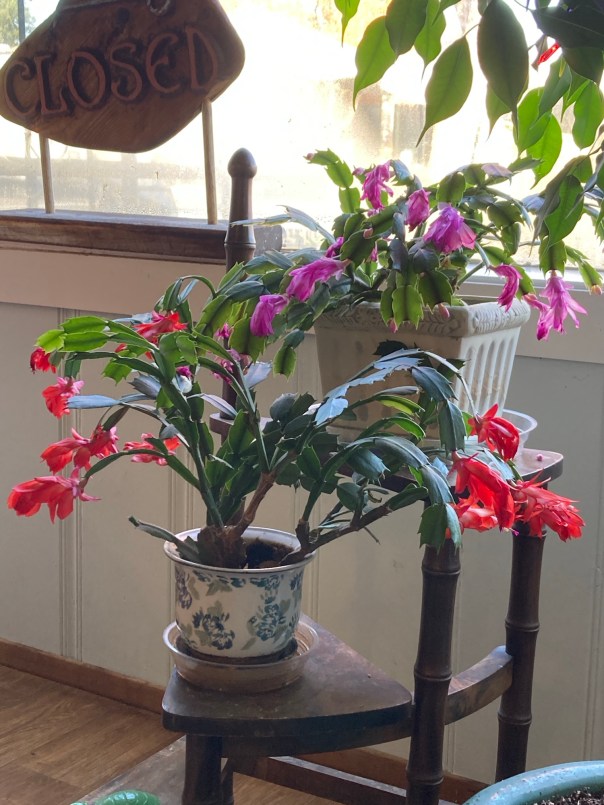 We still haven’t had a frosty night here, and there are none in the forecast, so many of my plants are still blooming. Indoors, it seems the Thanksgiving cactus flowers are on the wane, and the Christmas ones haven’t opened. Though when I got my hair cut the other day, my hairdresser’s two Thanksgiving cactuses were blooming away, in a western window.
