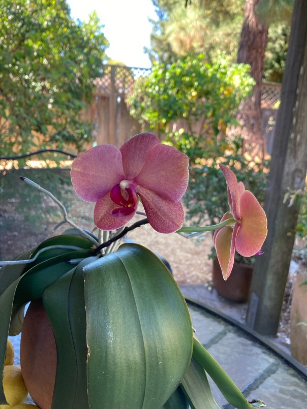 Orchid, with lemon tree in background.