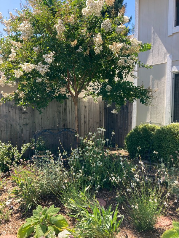 It seems to me that the irrigation system needs some adjusting; my thought is that as the plants are more in number and greater in size than when we first programmed it, and even since the last changes, I should customize it further. That job is a mental challenge for me, as there are six different valves/lines and three programs, for each of which one has to determine how many days per week and how many minutes of run time. As I have done so often, I will have to study the diagram and how to enter the settings via the dials and buttons, because it never sticks with me. If I just give some areas a little more water by hand, that will relieve my anxiety. It will be easier to tackle the problem if I am confident that nothing is dying of thirst right now.