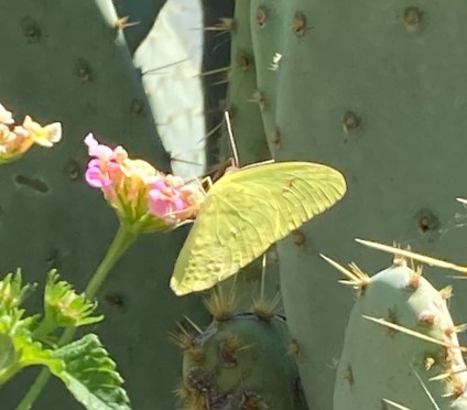I took many pictures of plants and butterflies! Lantana is interspersed with prickly pear cactus in the landscape, and we saw several species of swallowtail butterflies, skippers, this Cloudless Sulphur, and Queen Butterflies feasting on those flowers.