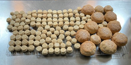 4. Lightly grease electric frying pan or cast iron skillet or paella pan. Heat over medium heat (about 300 degrees on an electric skillet) until a drop of water dances on it. Place dough carefully in pan, cover and cook about 15 minutes, until bottom is golden brown. Turn and cook another 15 minutes. Remove from pan and let cool on wire rack.