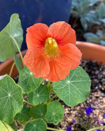 Once again, I planted nasturtium seeds in various places, early and later, and this year I got one plant to grow. Its first bloom just opened this weekend. Welcome, little flower friend!