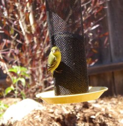 The birds seem to like feeding in the rain. The male goldfinch sat on top of the penstemon for a few minutes as it blew in the wind, while rain poured down. Eventually he came up to the feeder for his seeds. Even now when it’s almost too dark, I can see the doves and house finches flying in for one more bedtime snack.
