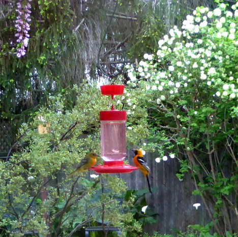 I haven’t tried in the last year or so to do much bird photography, but I found these pictures I did get when my new landscaping was still only sleeping and creeping. The background is much changed, but the birds look similar; probably at least the orioles are