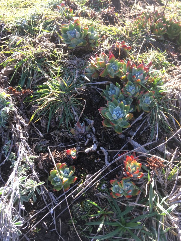 Succulents and mustard are related by their mutual membership in the plant kingdom, but also by being bright particulars of my weekend that also included lots of ocean watching.