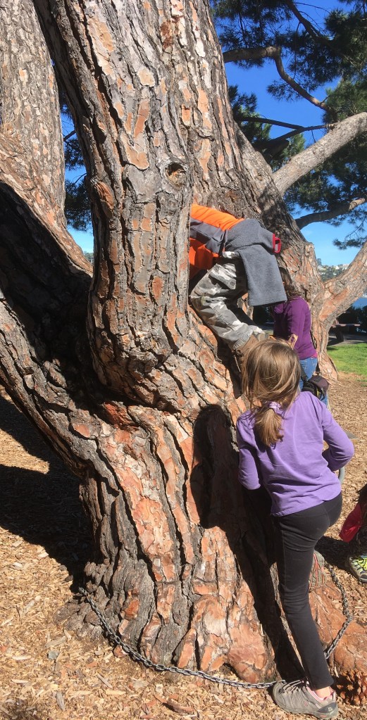 Big pine trees with gorgeous trunks shaded us at the park. Ivy and Jamie took on the challenge of climbing one of them. Their mother gave them tips from time to time; eventually Ivy gave Jamie her knee for a footstool, and he was up! Pippin then helped Ivy, and they finished their lunch in an elevated position.