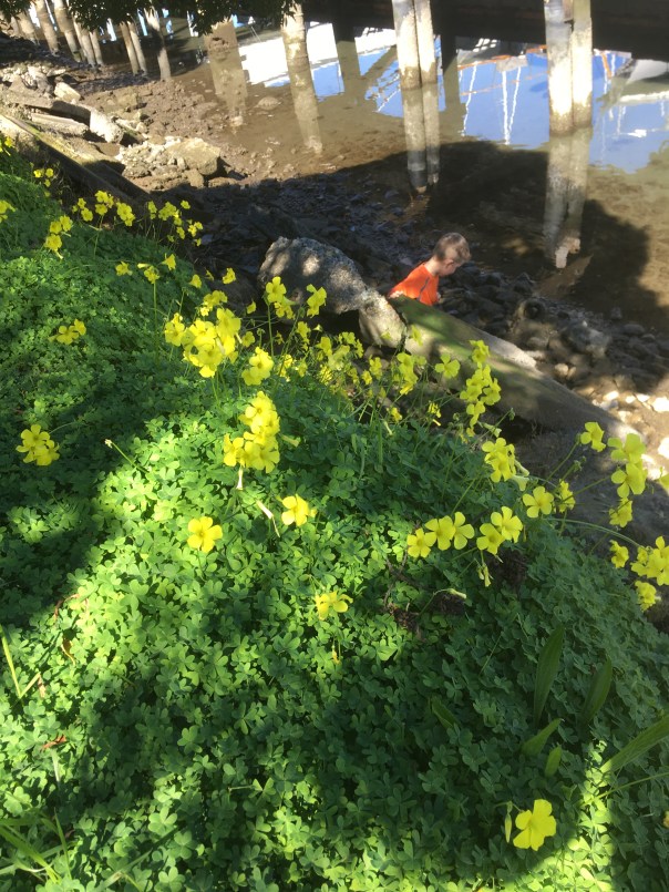 The first wild thing we found to eat that morning was oxalis, or sourgrass, also called wood sorrel. Once I told the children about it, they continued to break off stems and chew on it for the rest of the day, it being everywhere we went. Ivy liked the flowers best, but most of us preferred the stems.
