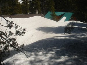 The house can only be used about four months out of the year, because it lies at 8200′ and sometimes gets buried in snow. It is the cabin with the brown roof. The owner of another cabin went in on snowshoes and took this picture.