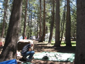 We stayed at White Wolf for the first time. Here is my husband hammering in the tent stakes. You can see the dark brown bear box in the background behind him. It was large enough for an ice chest and three other largish camp boxes. All food and smelly things have to go in there, NOT in your car, and certainly not in your tent, and then you lock it with a special kind of latch that bears can’t work.