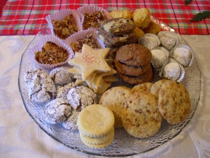 I was going to link you to the recipes…. Oops — I’ve never transcribed the recipes here! But the link on the Thumbprints above will take you to the recipe eventually. The photo of a cookie platter at top is from a few years ago. I hope tomorrow I can make a little more progress. It soothes my nerves to bake Christmas cookies.