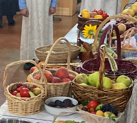 He made me realize that the virtues are the spiritual fruits that this feast brings to mind. Again, God is the Creator and Source of all invisible things like faith and love and kindness and patience. Just as we are incapable of creating the contents of our fruit baskets that we brought this morning, so we are not creators of the virtues. But we can work the soil with our prayers, and irrigate with the sacraments, and receive with thanksgiving the graceful sunshine in our hearts. “All that we have comes from God and we give it out of His hand.” (I Chronicles 29:14)