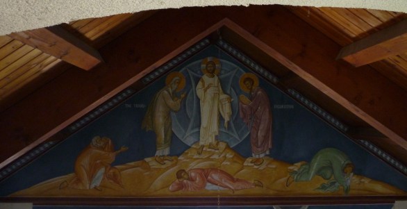 We were celebrating this wonderful Feast of the Transfiguration, when “as much as they could see it,” the Uncreated Light was revealed to three of Christ’s disciples. From where I was standing, I could see up high the fresco showing the event, and the disciples fallen to the ground. Matthew tells us that “He was transfigured before them. His face shone like the sun, and His clothes became as white as the light. And behold, Moses and Elijah appeared to them, talking with Him.”