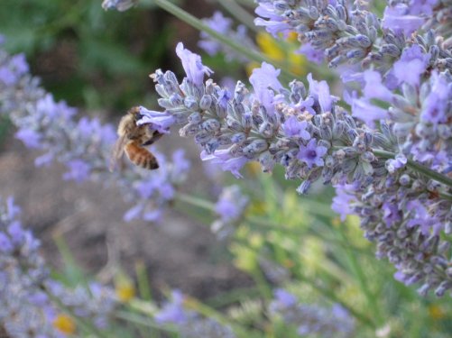 Lavender gives such a lot of pleasure over a long season, is unthirsty and very easy to care for. After the bloom, it’s short work to prune the bushes back, and then there’s no fuss until the next spring, when I can sit on the patio and watch the bees feeding off my own lavender. Weeks ago there were bushes in bloom in our area, but I kept watching in vain: the bees had not deemed mine ready yet. But today was the day! Just this morning there they were, a dozen of them buzzing around. It takes almost more patience than I have, to get a picture like this in a garden where the breeze is nearly constant. But I did it! So I have something to give today.