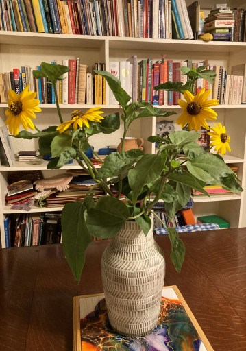 Our book group met yesterday, in a living room this time, because of heat and smoke; the smoke is still not from any wildfire nearby. We had lively discussion, mostly about A Long Walk with Mary, by Brandi Willis Schreiber, which I hadn’t read. The ways that the book had engaged such diverse women made me think I might like to read it myself in the future. We also talked a lot about what to read next, and we could not decide. No one wants a story so light as to be fluff, but they feel an avoidance for anything melancholic or gloomy right now.