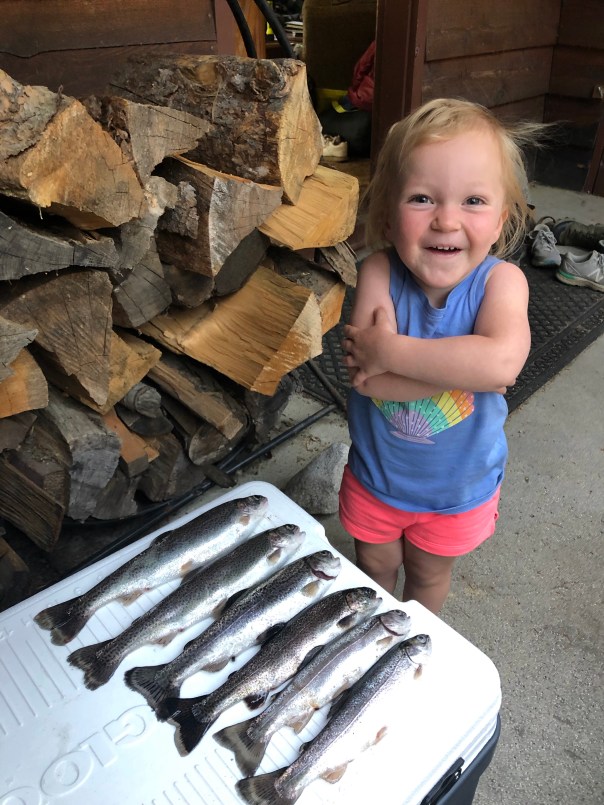 Last night Nate and Philosopher were gone fishing for a few hours, and they came back with six rainbow trout. This made Lora extra happy and she hugged herself again. The trout were featured at breakfast this morning while we contemplated God’s providence.