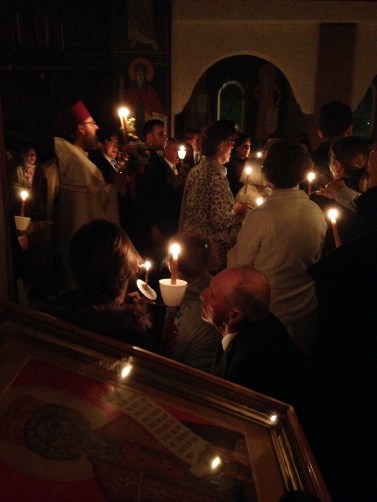 I want to back up and show you some scenes from Pascha, starting with the midnight service and our procession around the property, after which we arrived back inside the church to sing “Christ is risen!” by means of many words and melodies. We did this for a few hours, ate our joyous agape meal, and got to bed about 4:30 in the morning.