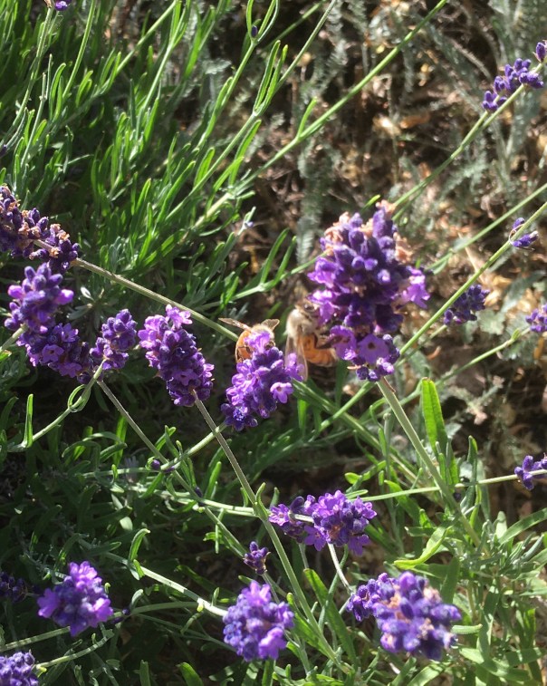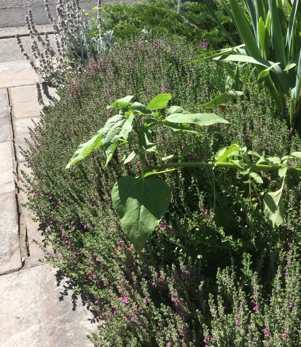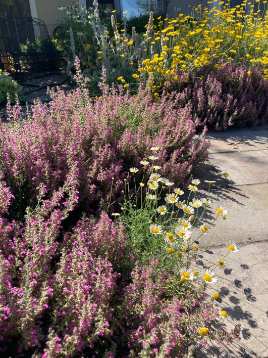 The front garden is burgeoning, everything bigger than ever, with an added flower growing out from under the germander hedge. It’s not like anything else growing on the property, or the neighbors’ properties, unless you compare it to the Golden Marguerite that can be seen behind it. The Seek app even said it was a Golden Marguerite, but if it is, its petals are albinos.