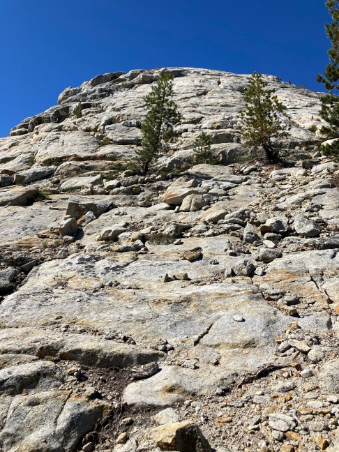 It took longer than expected for the whole expedition, because as we walked through an empty campground on the way, we met the campground host who loved to talk, and then his two “surprise rescue,” exuberant pups. That was fun, but eventually we started our ascent, which was slow and deliberate going as we adults cautioned the children about the gravel and the steep slopes. I avoided the trickiest gravel-strewn expanses of granite, and led our group into the manzanita ground cover higher up on the back of that hunk of rock, where we admired the lichens and flowers as we headed for the small dome to the side, which is easy to climb.