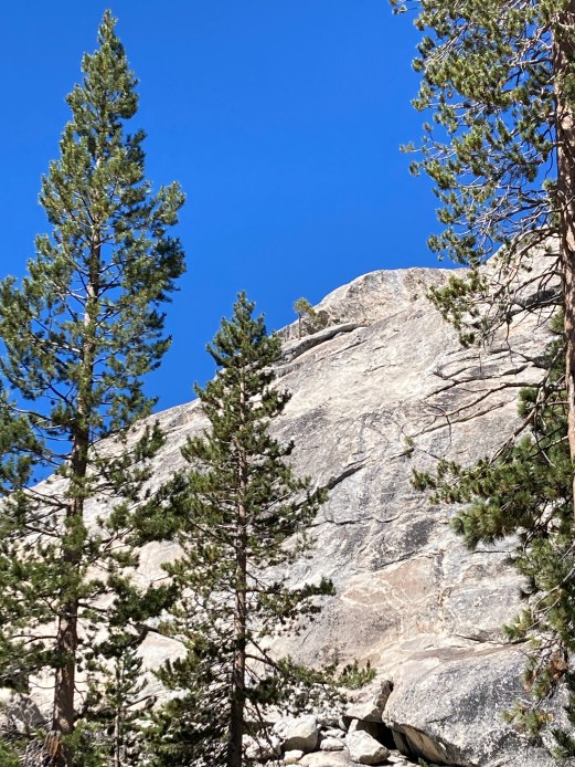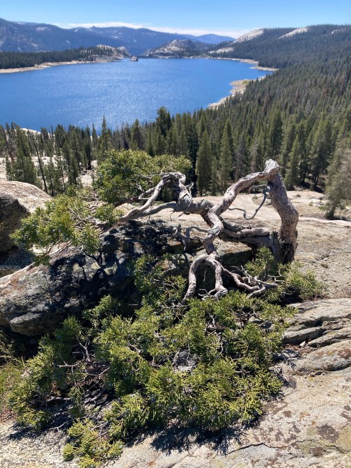 Then I found my friend, which is actually two trees intertwined, a Sierra Juniper and a pine. It/they were christened “Double Hug,” seeing as the two are in a forever embrace by means of large roots lying next to each other, and even their branches tangled together. We hugged the trees, and posed on the bench formed by those hugging arms.