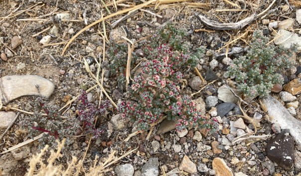 What we learned later when we were able to research it online was surprising and a little sad. This plant Halogeton glomeratus is not a native plant but was introduced from Russia and China; it is a noxious weed of the amaranth family in rangelands of the American West, because of what it does to livestock and to the soil. Grazing sheep are especially vulnerable and can be killed by the high levels of oxalates it contains, and the mineral salts it excretes into the soil make it hard for other plants to survive. Two different species of plants have been introduced that tolerate the salts and might compete under the harsh conditions of that territory. The seeds of Saltlover “have the ability to germinate within one hour after being exposed to water.” That is vigor!