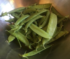 That Big Friendly Giant pea patch I’ve got is a wonder of my garden world. It just keeps growing and being green and lush, producing new baby pea pods every day. I wander around the edges of its kingdom and peer into the jungle of vines, trying not to miss any of the ripe ones, wondering if I should let this or that one grow one more day. I’m pretty sure that one day this week there are going to be about a hundred of the sugar snap peas all ready at once. Each pea pod is lovely and tender-crisp, and begs to be eaten the moment after being picked.
