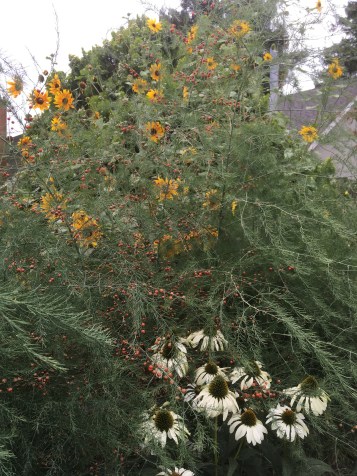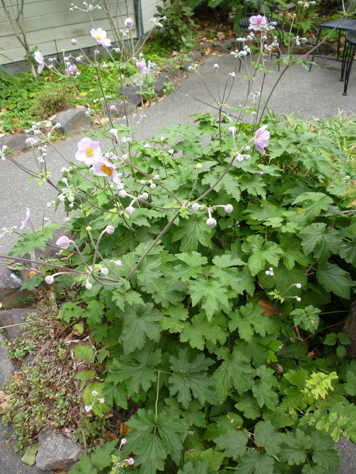 When I noticed the Japanese anemones looking better than ever, it occurred to me to plant a few more this fall, maybe some pale pink ones — but I corrected my impulsivity in time, and won’t be taking on one more project, what with so many others unfinished. A more reasonable goal would be to try to take better care of the anemones I have, and see if they can be encouraged to be taller and more robust. It’s a sign of their middling health, that they do not ever spread and multiply, and their flowers are few and small.