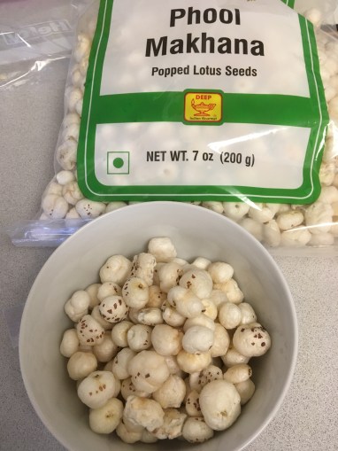 One package I picked up at the Indian market was a large bag of phool makhana or puffed lotus seed, a sort of popped-corn form of the seed of the lotus plant Nelumbo nucifera. When I was in India one restaurant that specialized in salads sprinkled a few of these puffs on top of one concoction that I loved.