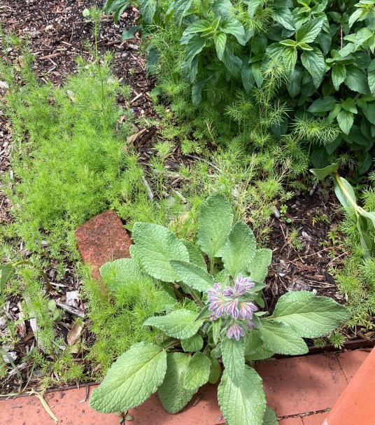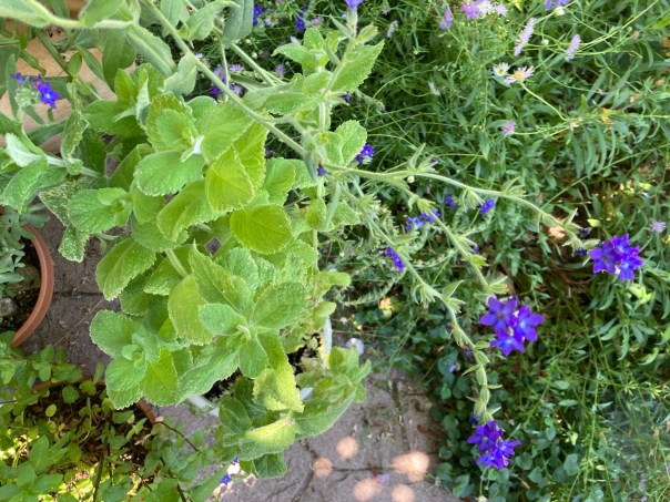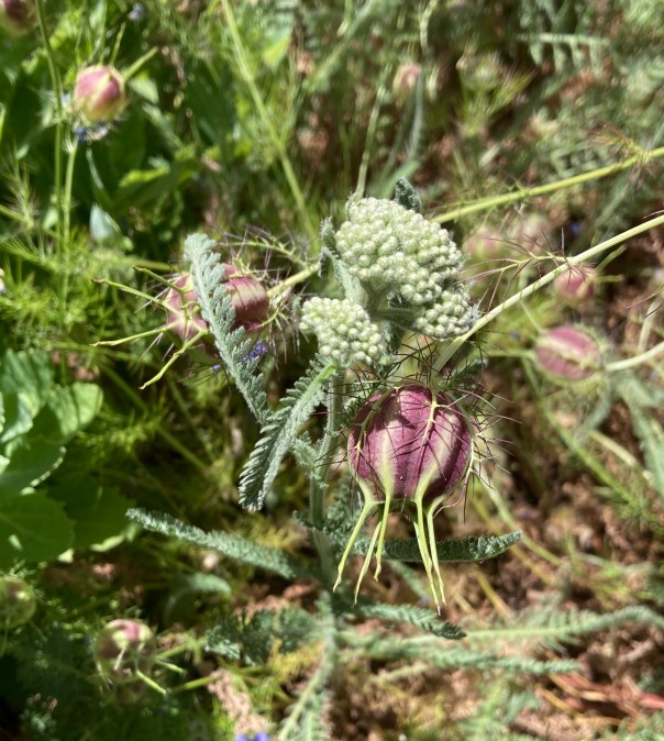Nigella, or Love-in-a-Mist, has spread its soft, blue-blossomed self all over the place, so much so that I needed to rescue a lot of plants from the stems that had grown tall, taller, and so tall, with their seed pods getting heavy, that they lost their balance and fell down on the surrounding lavender, germander, yarrow — whatever was there, trying to come into bloom itself.