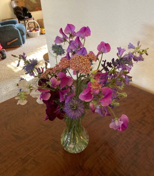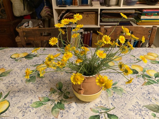 When I was lifting nigella off the echinacea out front, I noticed that the Golden Margeurite also was encroaching and reclining, on the germander nearby. I had to cut it back a lot, but you can hardly tell, there is so much of it. I brought it indoors and it has made a long-lasting bouquet of golden sunshine.