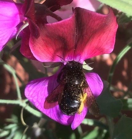 Later that afternoon I had planned to have him help me clean the greenhouse, but then realized he’d like better to pick sweet peas to take home to his mother. I have only a little patch that I didn’t pull out yet. He was diligent about that task for nearly an hour, and collected a large jarful. I made headway on the greenhouse, and we took breaks to study the bumblebees that only recently decided to mob those flowers.