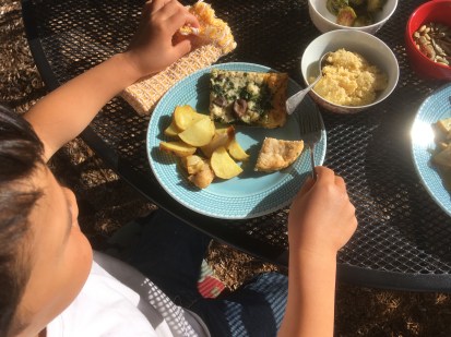 We ate flower petals, and got to bed late, and the next morning the boy picked more right next to my garden dining spot, which he added to our breakfast feast. Rarely is it truly the right weather to eat breakfast outdoors here in my city, and this may have been my first time to do it with company so agreeable.